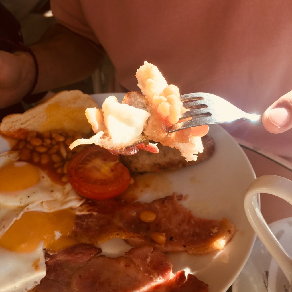 一頓英式早餐的基本構成是抹了奶油的烤土司、煎的油亮的荷包蛋或炒蛋、肥滋滋的香腸和培根、蕃茄口味地獄來的焗豆、和欺騙自己吃得很健康的烤蕃茄或炒蘑菇,偶爾還會有薯條。該如何吃英式早餐呢,C提供了一個不算正統但頗為流行的吃法,將盤中食物切成小塊串上叉子,順序無所謂但最後一個必是沾滿焗豆湯汁的吐司當底,