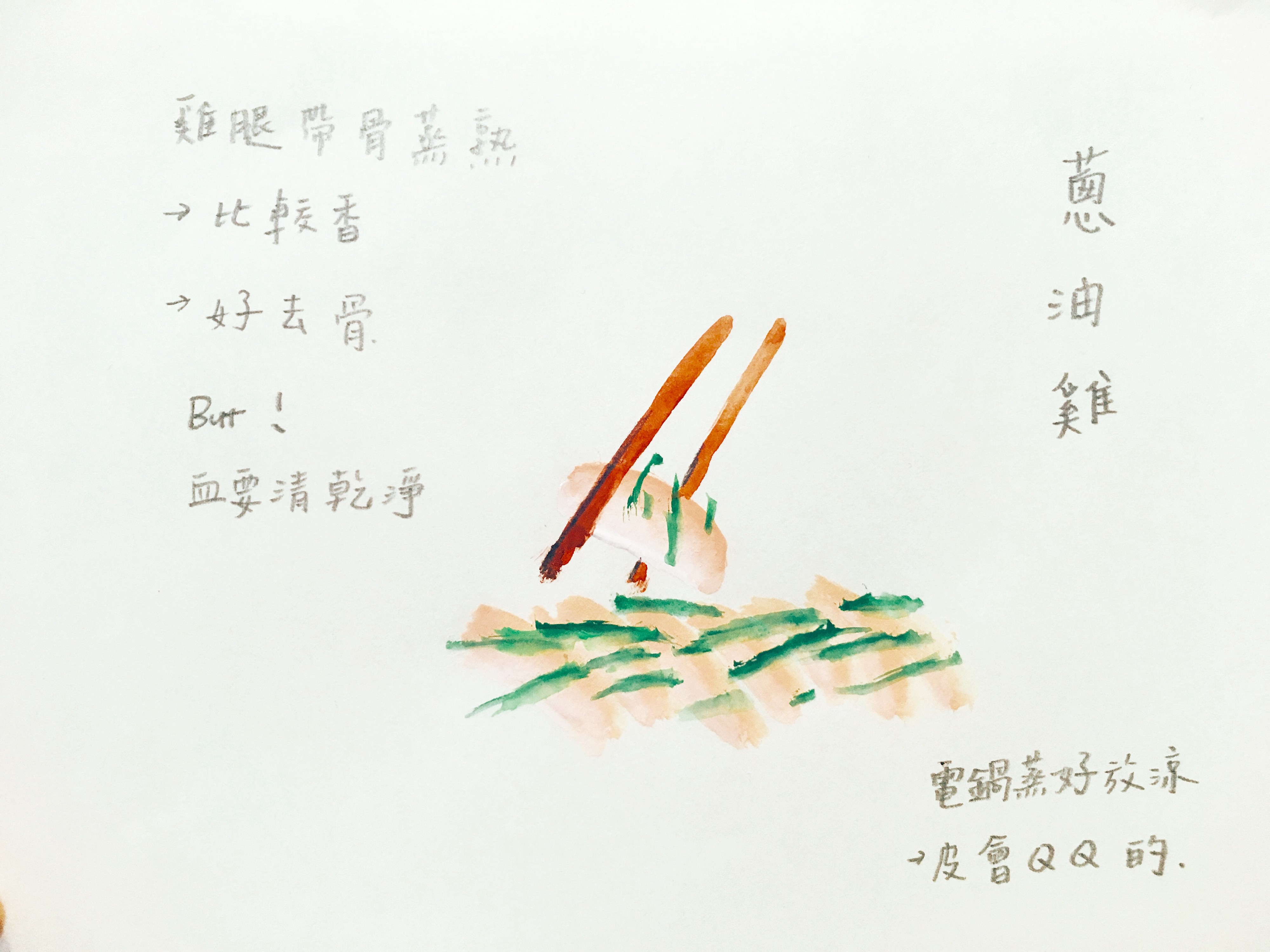 蔥油雞名列我心中最偷懶但又上相的食物,雞腿去骨加米酒、鹽與白胡椒粉醃漬三十分鐘後放電鍋與蔥段蒸熟,雞汁另外裝碗,隔天上桌前小火煮雞汁與切絲的蔥,最後淋在雞上上桌。出乎我意料,每次一出蔥油雞都歐亞通殺,所有人爭想搶著吃並要食譜,這對三杯雞苦手的我來說完全是福音啊而且又省調料,決定將它命名為窮學生宴客好幫手。