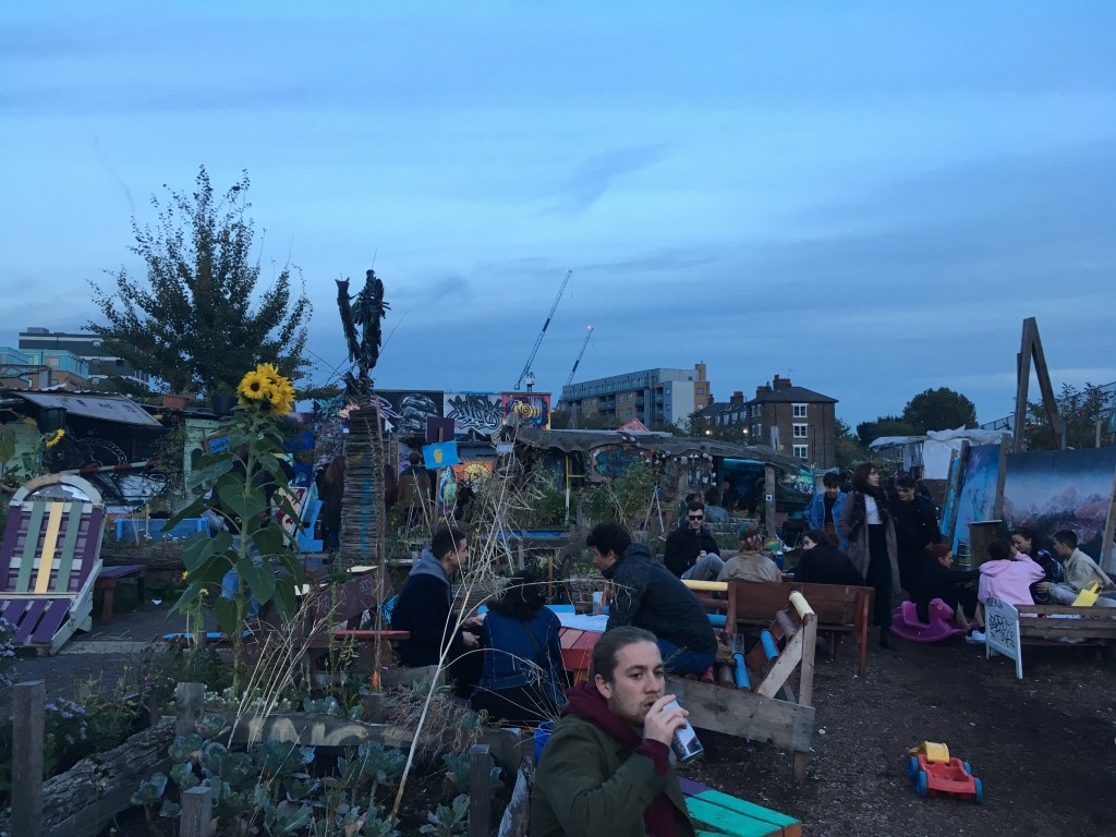 Nomadic Community Gardens是在Brick Lane附近的小型社區,約略兩年前興起。位於兩條鐵路線中的城市綠洲,種植滿各式合法與非法的植物,人們平時拿著酒在此聊天閒晃,或坐或臥地賴在棧板、油罐桶和搖搖欲墜的傢俱上,破舊的棚架搭起一個舞台、咖啡吧與小型展示空間,但周遭的塗鴉永遠都比展示空間裡的更酷一點。