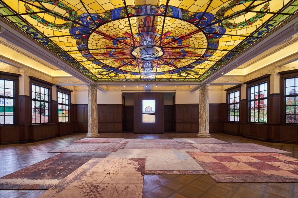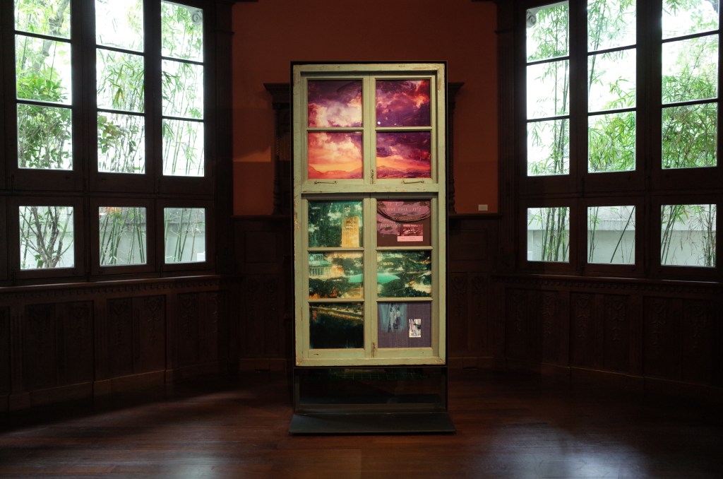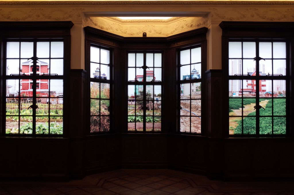 然而李青的展卻是扎扎實實融入整棟大宅歷史,他玩弄著時間語言,一片片被設立在一樓的窗板《迷窗》與老宅既有的花窗互望,仔細一瞧門上繪製的迷離風景,既有殖民時期的洋行華宅、也有共產風格濃厚、宣揚國威意味的上海展覽中心,還有當今中國特色資本主義發展下的浦江大樓,片片花窗都像是百年來上海的細胞切片。這些建築推動了城市發展,亦在發展的進程中挪為他用,窗框上映照出的風景如在霧中,和這城市一樣讓人看不透。