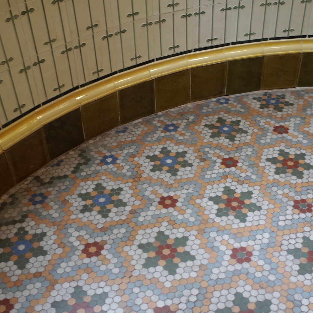 榮宅後方宴會廳的彩色玻璃穹頂,無非就是這榮宗敬宴請貴賓的見證者,Prade入主修復時此屋頂已經殘破頹敗了,只能仰賴著榮家孫子的記憶,重新以用1940年代的波蘭手吹玻璃安裝回那個氛圍。襯托這洋氣十足的花窗則是環繞結構牆的柚木護牆板,當年每面牆板可都鑲著螺鈿,在電器燈的照射下閃閃發光著,人們夢迴魔都說得就是這場景。
